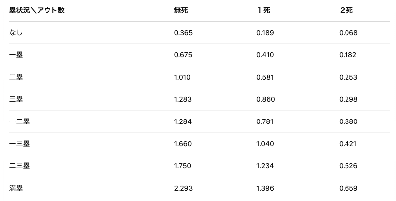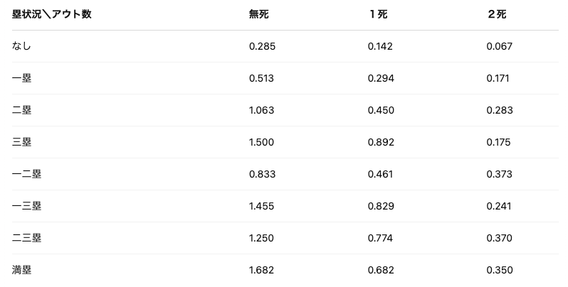 「得点期待値」とは、塁上の走者やアウト数の状況を24パターンに分類し、その状況から同一イニング中(3アウトとなるまで)に獲得できるであろう平均的な得点のことです。言葉だけでは分かりにくいので実際に表で見てみます。