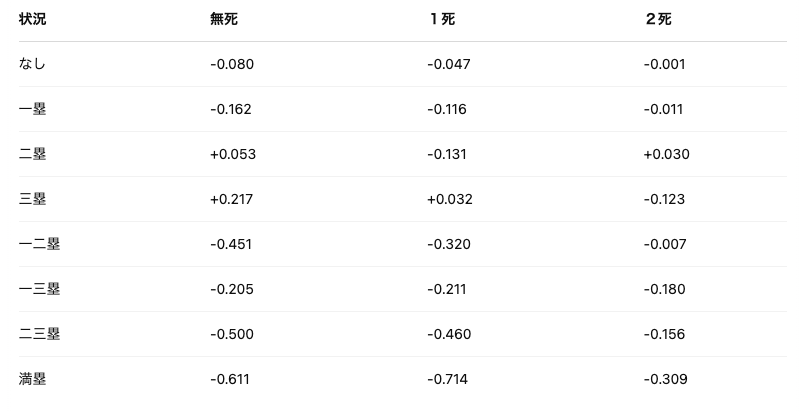 以下の表は中日ドラゴンズの得点期待値からNPB全体の得点期待値を引いた値を表にしたものです。