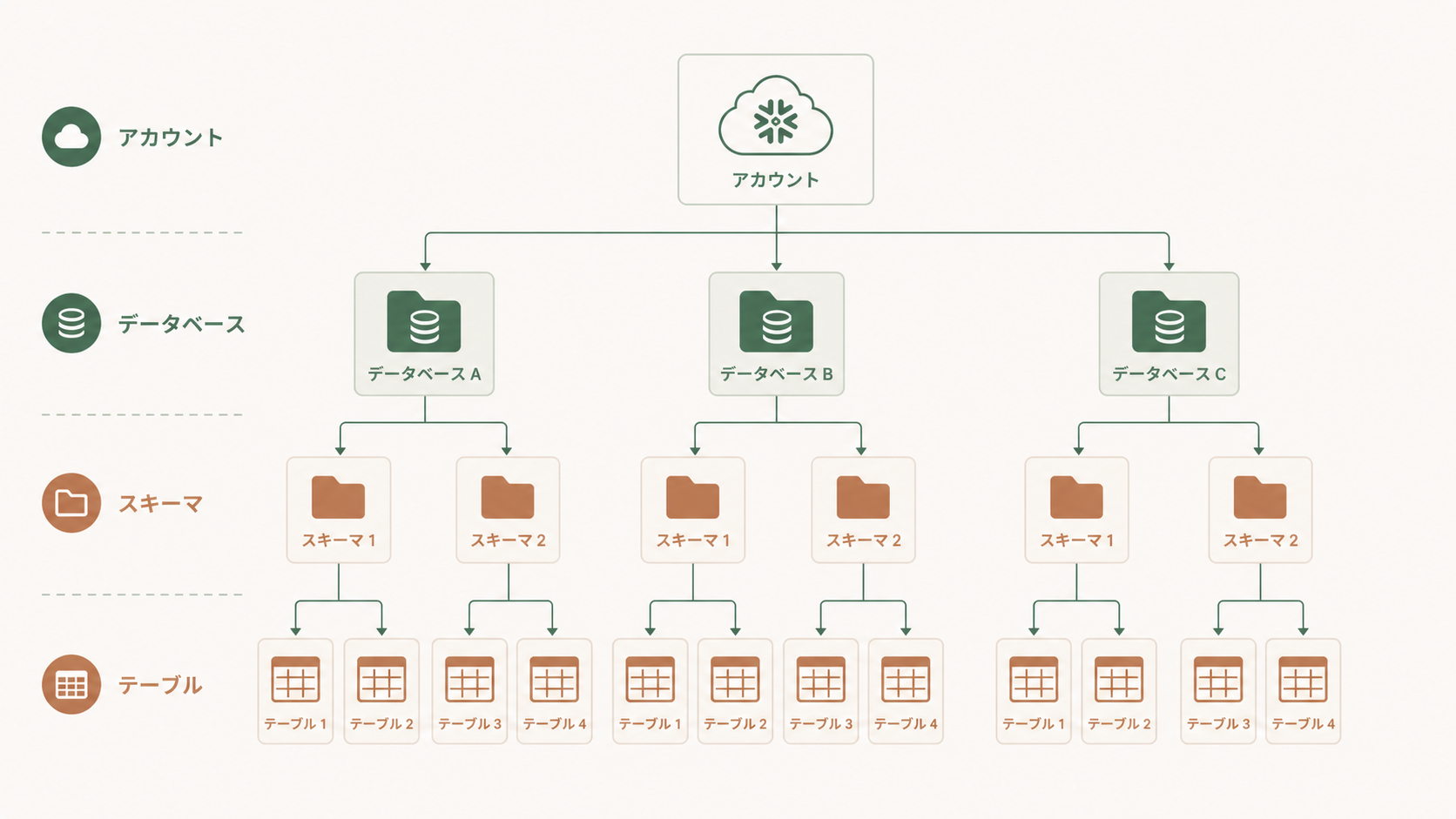 Snowflakeではアカウントの中に複数のデータベースを作れて、その中に複数のスキーマ、さらにその中に複数のテーブルを置く――というツリー構造になっています。この基盤を支える仕組みについてはSnowflakeの3層アーキテクチャを初心者向けにやさしく解説もあわせてどうぞ。