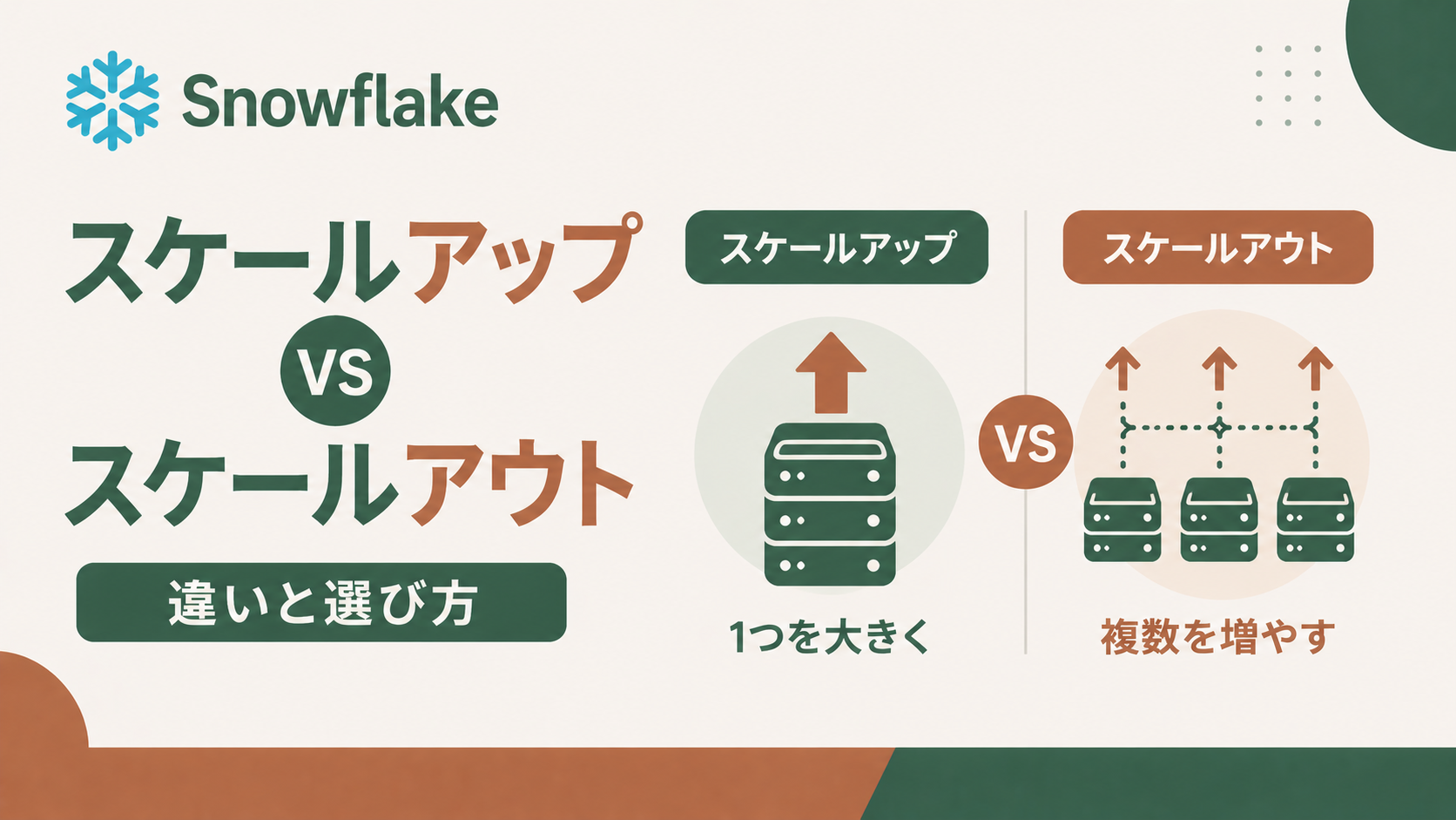 Snowflakeを使い始めると、「クエリが遅いな…」「同時実行が多くて待ち行列ができている…」といった悩みに必ず出会います。そんなときの解決策が スケールアップ と スケールアウト の2つ。名前は似ていますが役割はまったく違います。この記事では、フレンドリーな例えを交えながら、それぞれの違いと使い分け方を初心者向けに解説します。