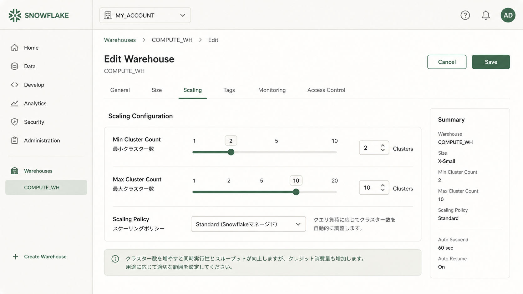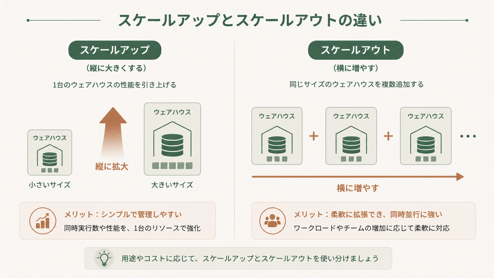 - スケールアウト:同じサイズのウェアハウスを複数台に増やす(クラスター数を増やす)