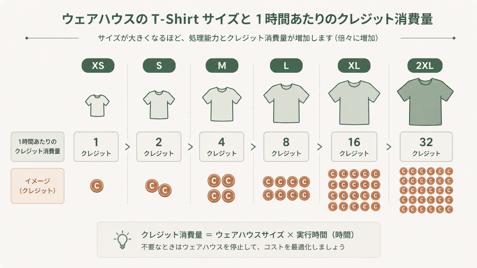 ウェアハウスのサイズは、洋服のように XS, S, M, L, XL, 2XL, 3XL, 4XL, 5XL, 6XL という単位で指定します。1サイズ上がるごとに、内部のサーバー台数が 2倍 になり、消費クレジット(時間あたりのコスト)も 2倍 になります。