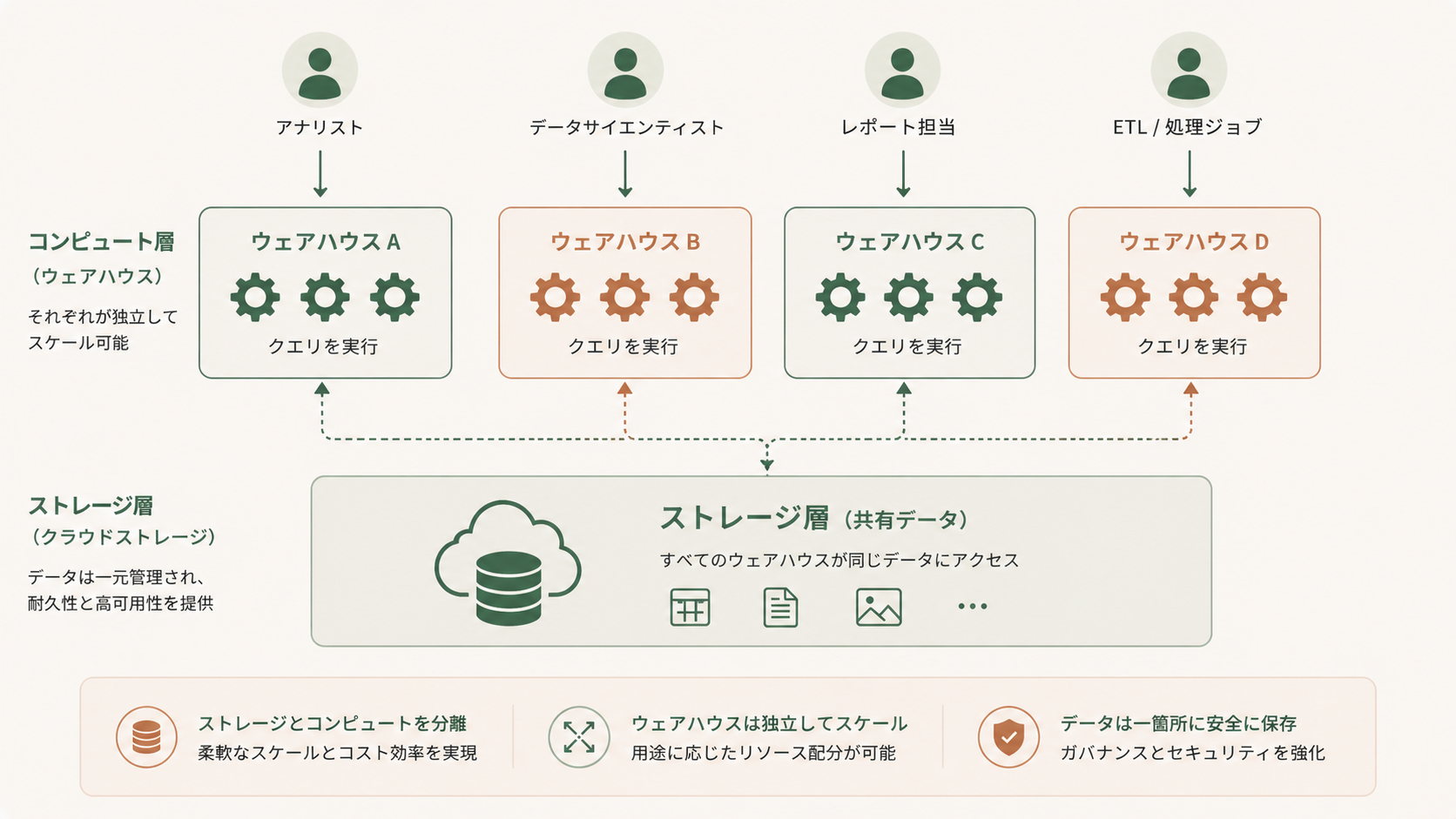 Snowflakeは 3層アーキテクチャ を採用しており、「ストレージ層(データ置き場)」と「コンピュート層(計算エンジン)」が完全に分離しています。仮想ウェアハウスはこの コンピュート層 にあたり、必要なときだけ起動して使う”クラウドのレンタルサーバー”のようなイメージです。