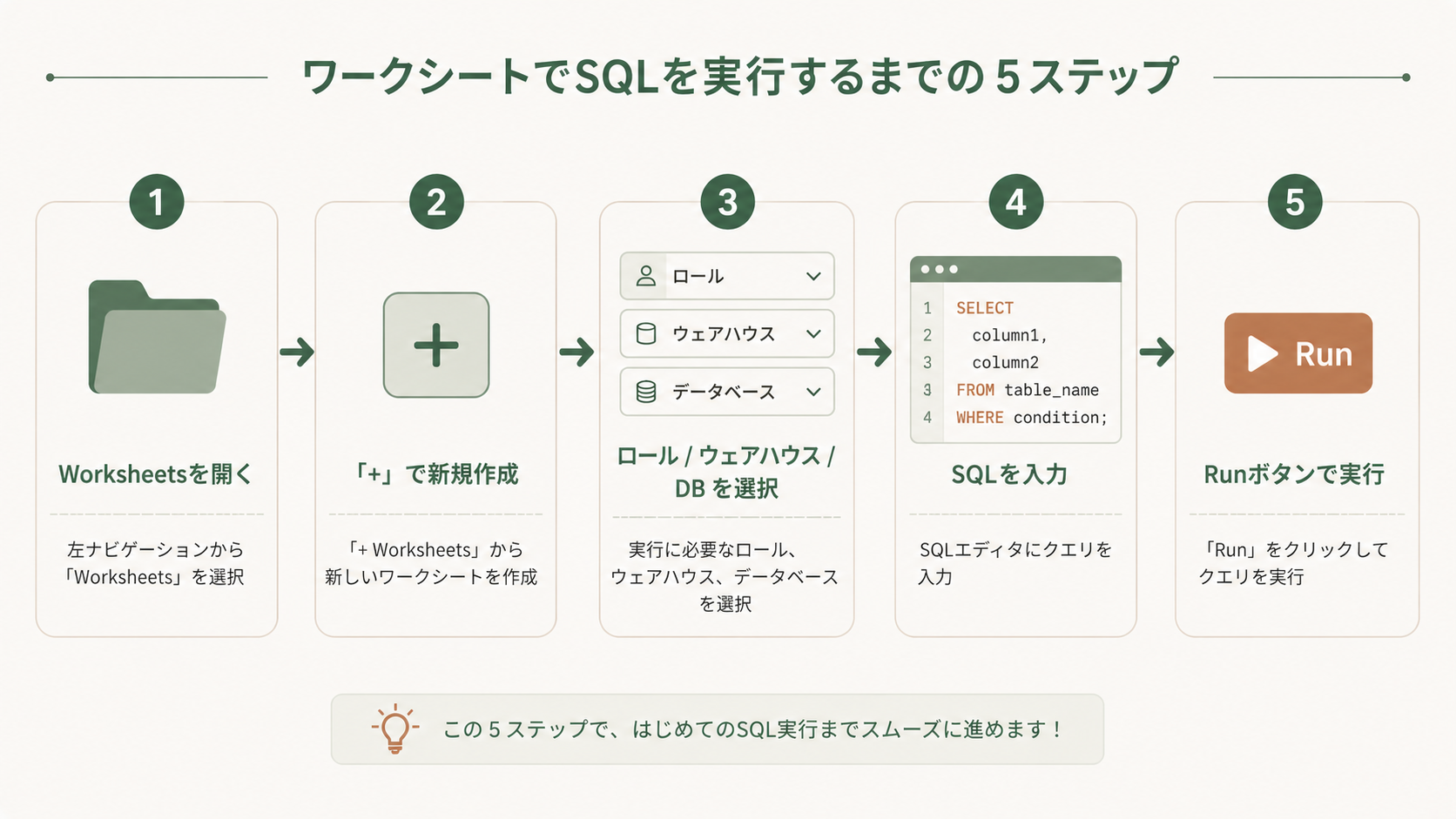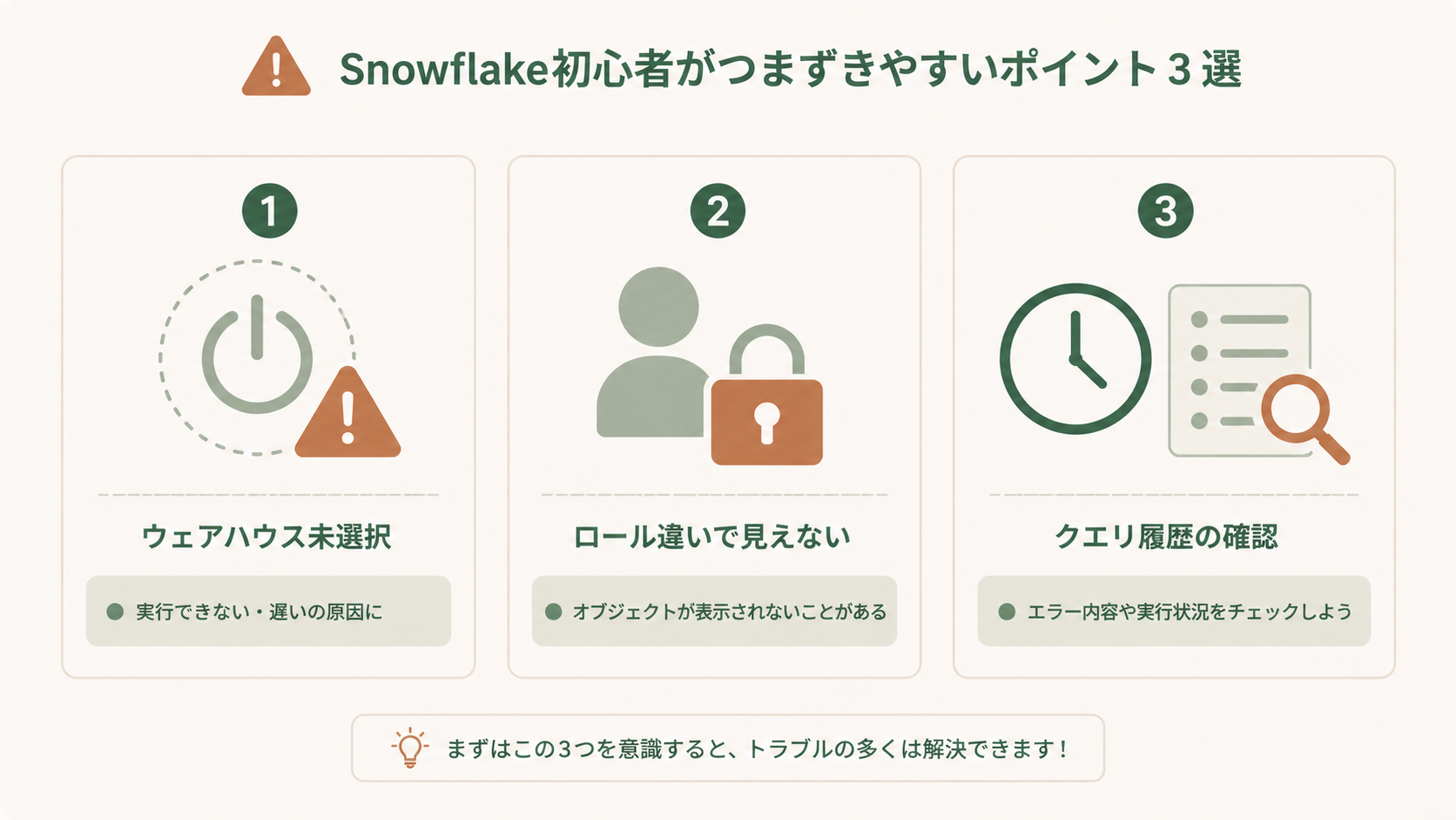 - ウェアハウスを選び忘れる:ウェアハウス未選択だとSQLが実行できません。エラーが出たらまず上部を確認!