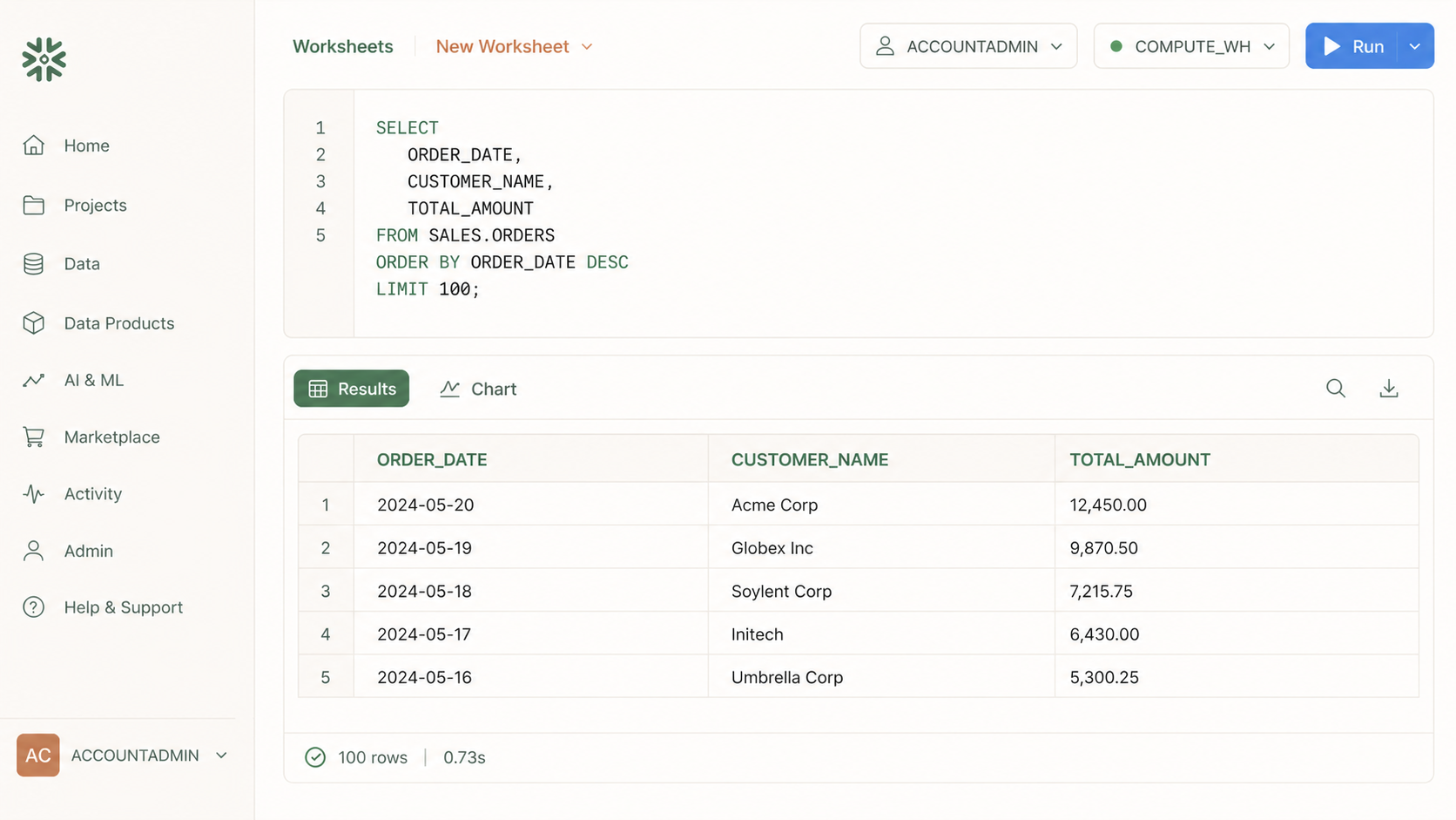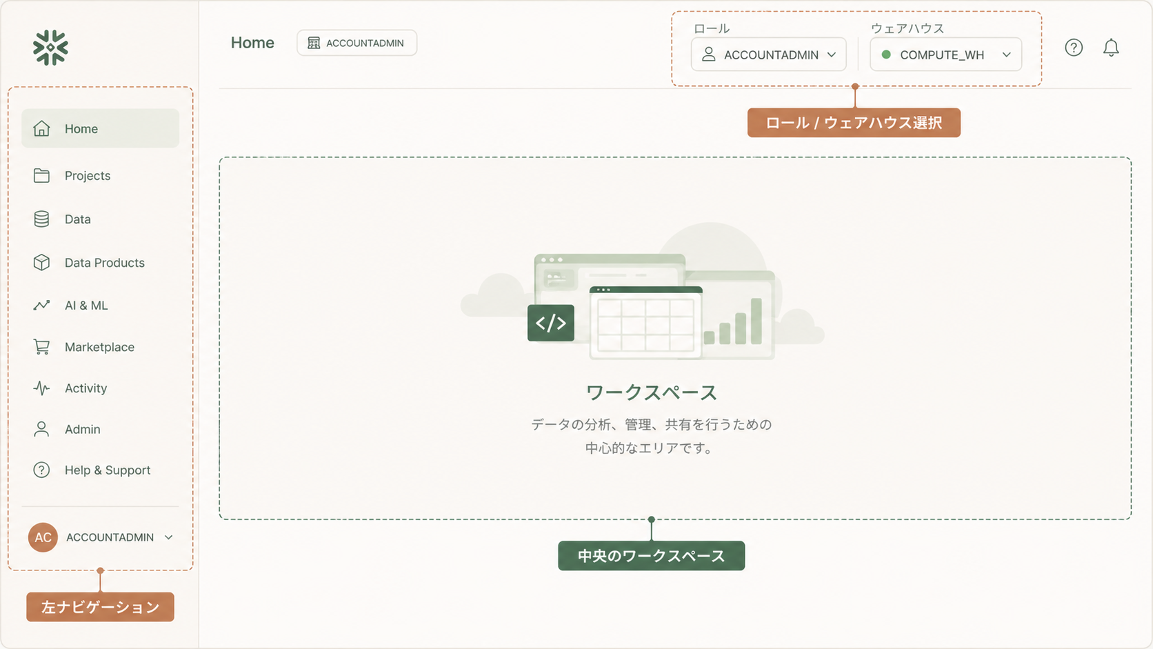 - Admin (Warehouses / Users & Roles / Cost Management):ウェアハウスや権限、コストの管理
